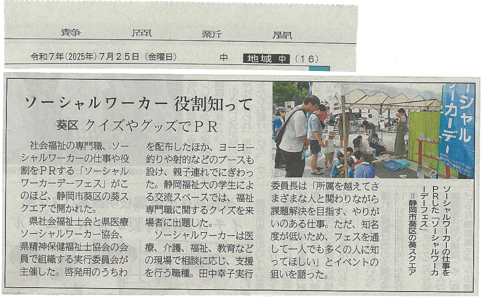 今年も7月19日(土)にソーシャルワーカーデーフェスを静岡市の葵スクエアにて開催しました。安倍川の花火大会当日であったので、縁日の雰囲気を出し、ソーシャルワーカーがヨーヨー釣りや射的、もしバナゲームを準備しました。大学生との交流ブースや就職・進学説明の福祉人材センターのブースも設置しました。残念ながら花火大会は中止でしたが、射的とヨーヨー釣りブースに多くのこども達が立ち寄って楽しんでくれ、親御さんたちにはうちわを配布しソーシャルワーカーの啓発を行いました。うちわ300枚配布、スタンプラリー91枚配布、来場者200人程度。社会福祉士会ではLINKメンバーが中心となって、ヨーヨー釣りと職場案内の掲示を行いました。(社会福祉会から参加スタッフは11名)